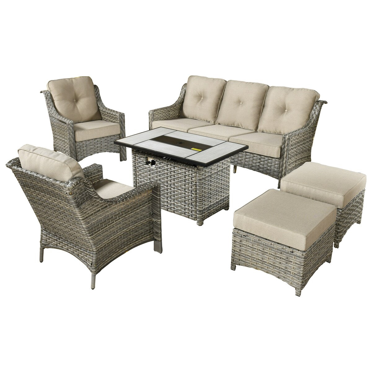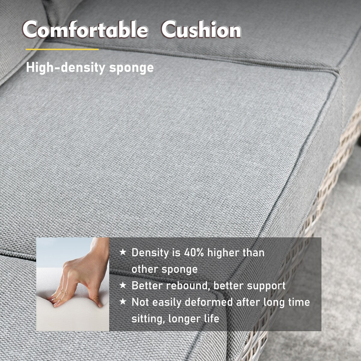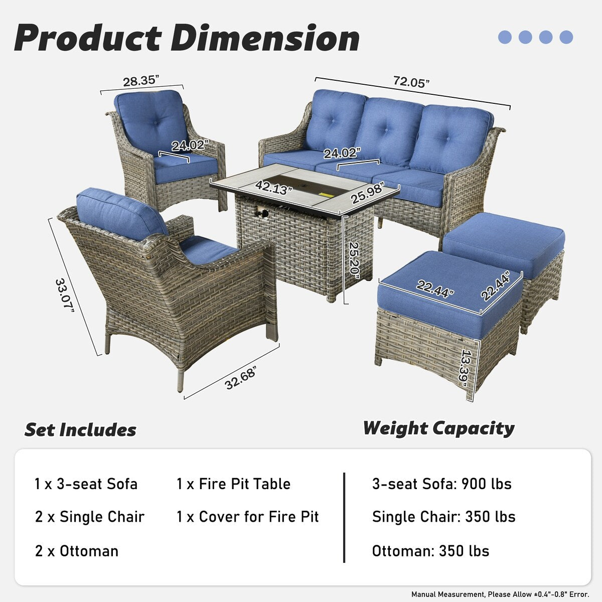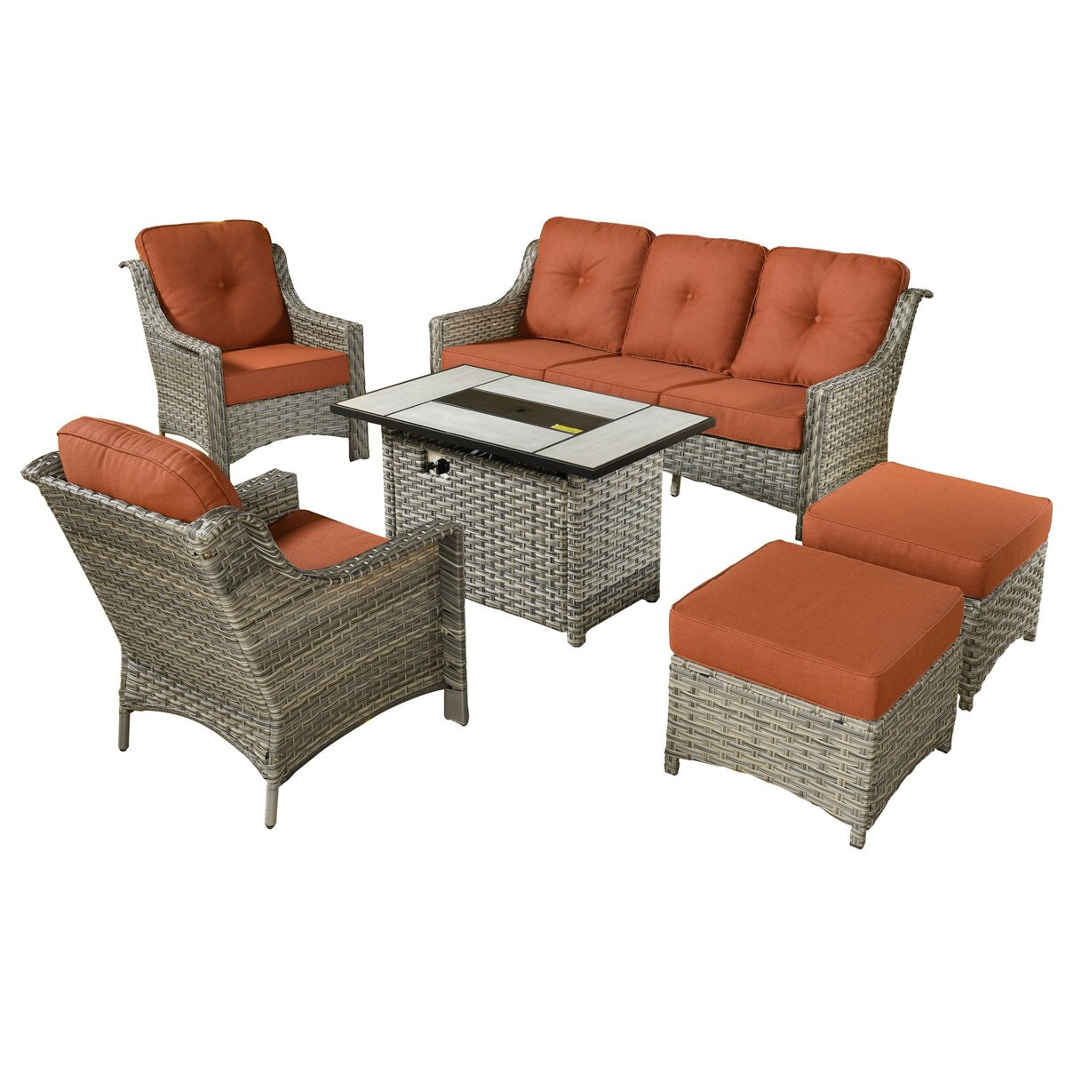 Enjoying your outdoor activity with XIZZI patio rattan conversation sofa set with fire pit table . UV-resistant and all weather handwoven PE wicker is designed for outdoor use. High quality yarn-dyed fabric wears well and is thicker, good texture and easy to clean. Ergonomic design chairs with high back and deep seat can support good posture and make you feel more comfortable. 42' wicker woven firepit can be used as dining table with the metal lid covered, and its good to place drinks, food and snacks. Ceramic firepit table top is easy to clean, more beautiful and heat-resisting.