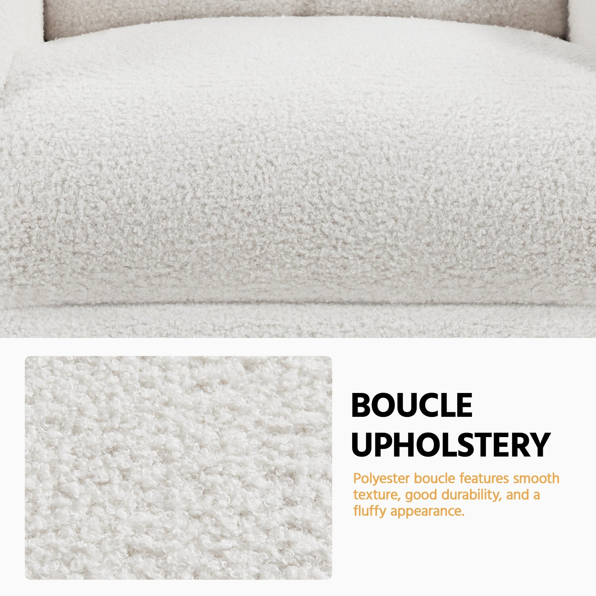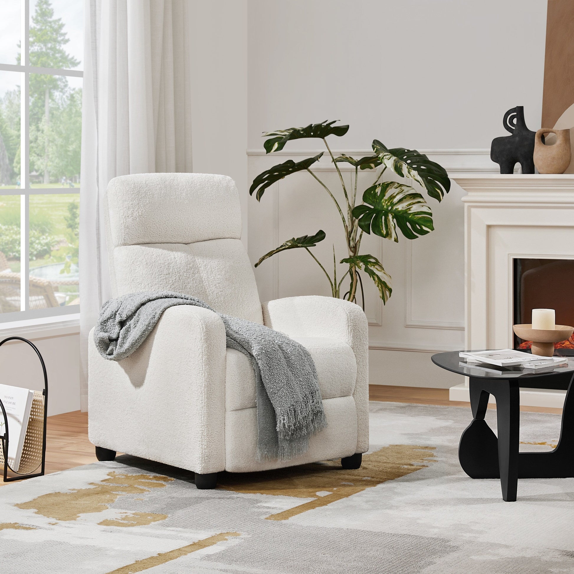 An ideal ?combination of comfort and style - this boucle recliner is crafted with a ?sturdy engineered wood frame, soft and warm boucle upholstery, plush ?fiber fills, and resilient pocket springs, easily supporting up to 265 ?lb. Adjust the backrest and footrest to your preference - sit upright, ?elevate your legs, or lay flat. A gentle push on the backrest ?effortlessly lifts the footrest to any angle between 0 and 90 degrees. ?Sink into the marshmallow-like softness of the seat and backrest after a ?long day. This recliner is here to pamper you and provide the ultimate ?seating experience. Whether you place it in your living room, bedroom, ?home theater, office, or any other space, this reclining sofa is a ?fantastic addition that will elevate your space to new levels of comfort ?and sophistication.