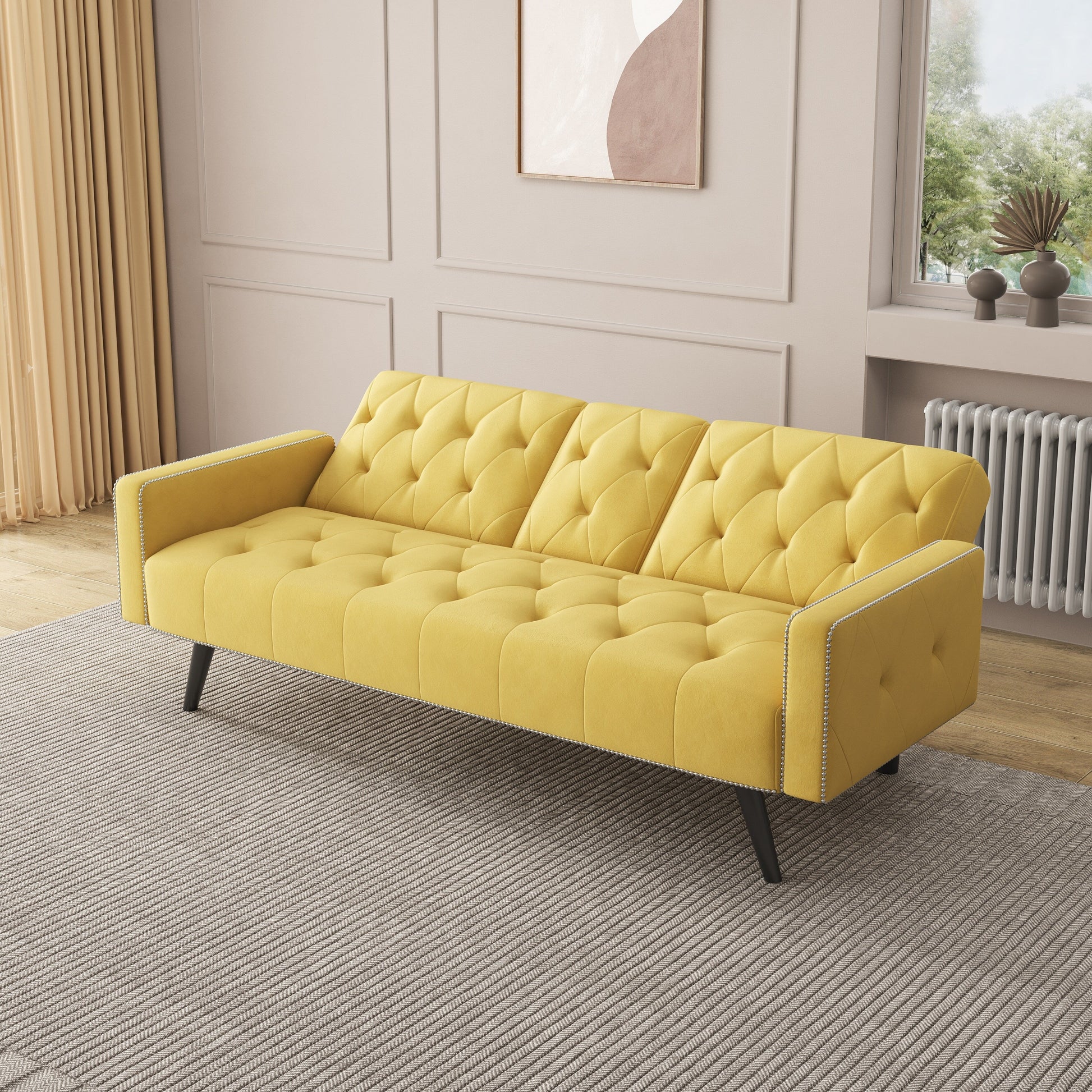 Stylish Design: Crafted with exquisite velvet fabric, this sofa boasts a tufted backrest and seat, accented by elegant armrests and nailhead trim detailing along the armrests and seat front. The even stitching adds a touch of sophistication, enhancing both comfort and aesthetic appeal.
