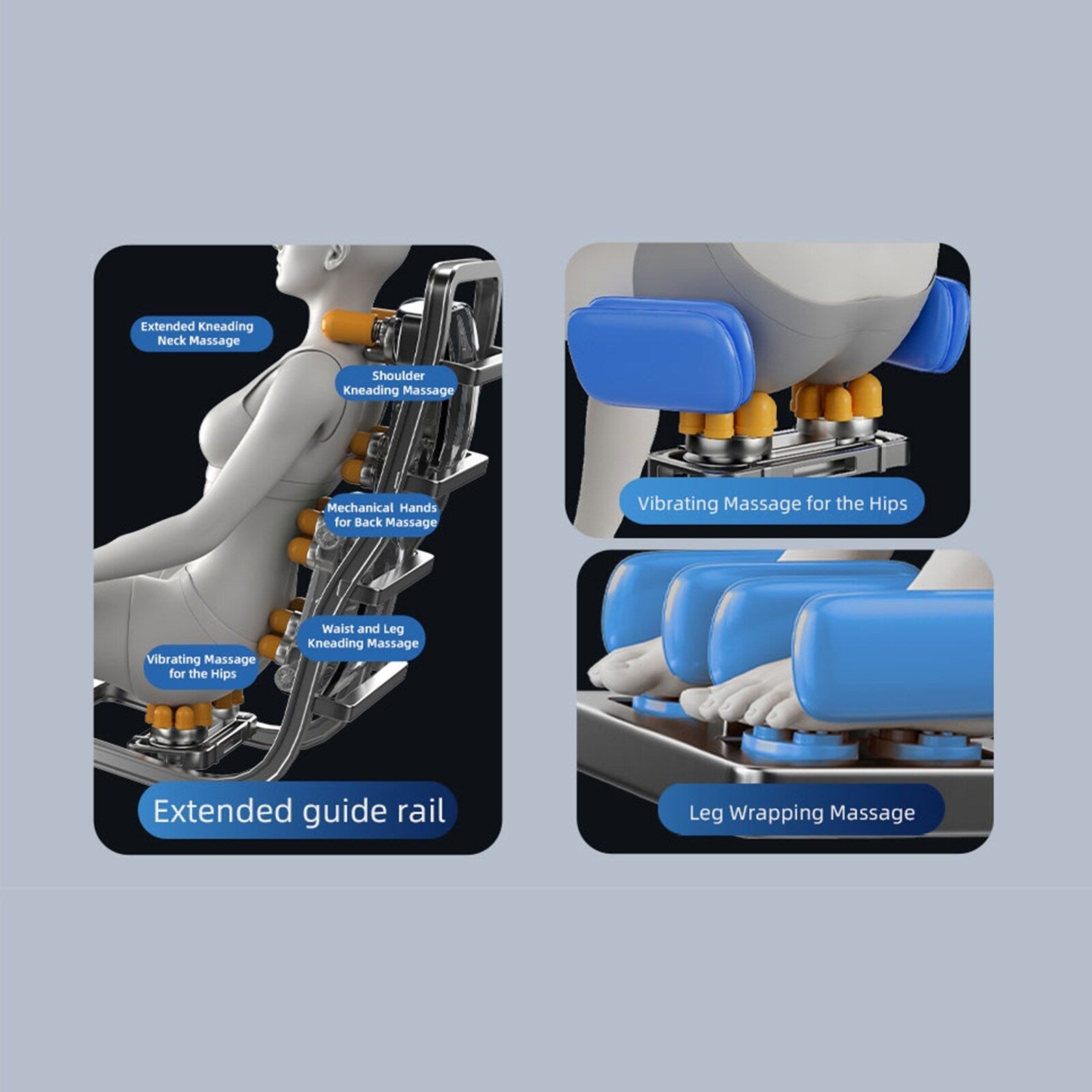 Experience unparalleled relaxation and health benefits with this Zero Gravity Massage Chair. Equipped with 20 intelligent airbags distributed across the shoulders, arms, buttocks, and legs, it offers 3-speed force adjustment to simulate real-person massage techniques, deeply releasing muscle tension. The 8 fixed rollers and 2 hip rollers, combined with 2 waist heating components, provide precise point massage, effectively relieving back and waist pain while warming and caring for your health. The zero gravity feature simulates the state of weightlessness in space, aligning the heart and knees on the same horizontal line to reduce heart load, promote blood circulation, and relieve back pressure. This chair is designed for easy installation, with a plug-and-play setup and clear, illustrated instructions, making it accessible even for beginners. Its user-friendly design ensures easy movement and placement, saving space and enhancing your living or working environment. Whether you're looking to unwind after a long day or seeking a healthier lifestyle, this massage chair is the perfect solution for ultimate comfort and well-being.