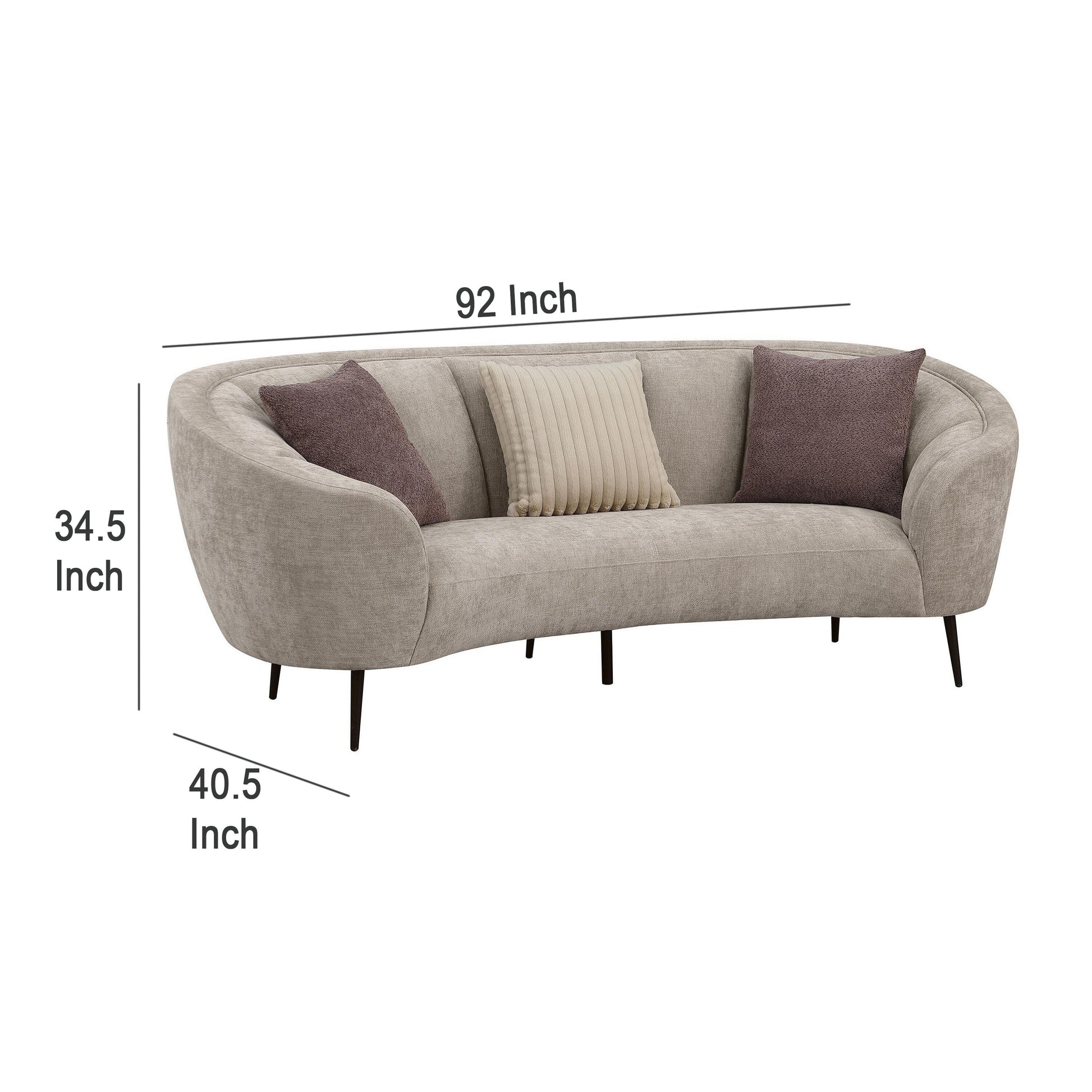Transform your living room with this modern beige upholstered sofa, constructed using plywood and eucalyptus wood. Its rounded, kidney-shaped silhouette features extra-wide channel details and plush foam cushioning for ultimate comfort. It is supported by sleek, tapered black metal legs, providing vintage charm and airy support. Explore our Zui collection for more options.