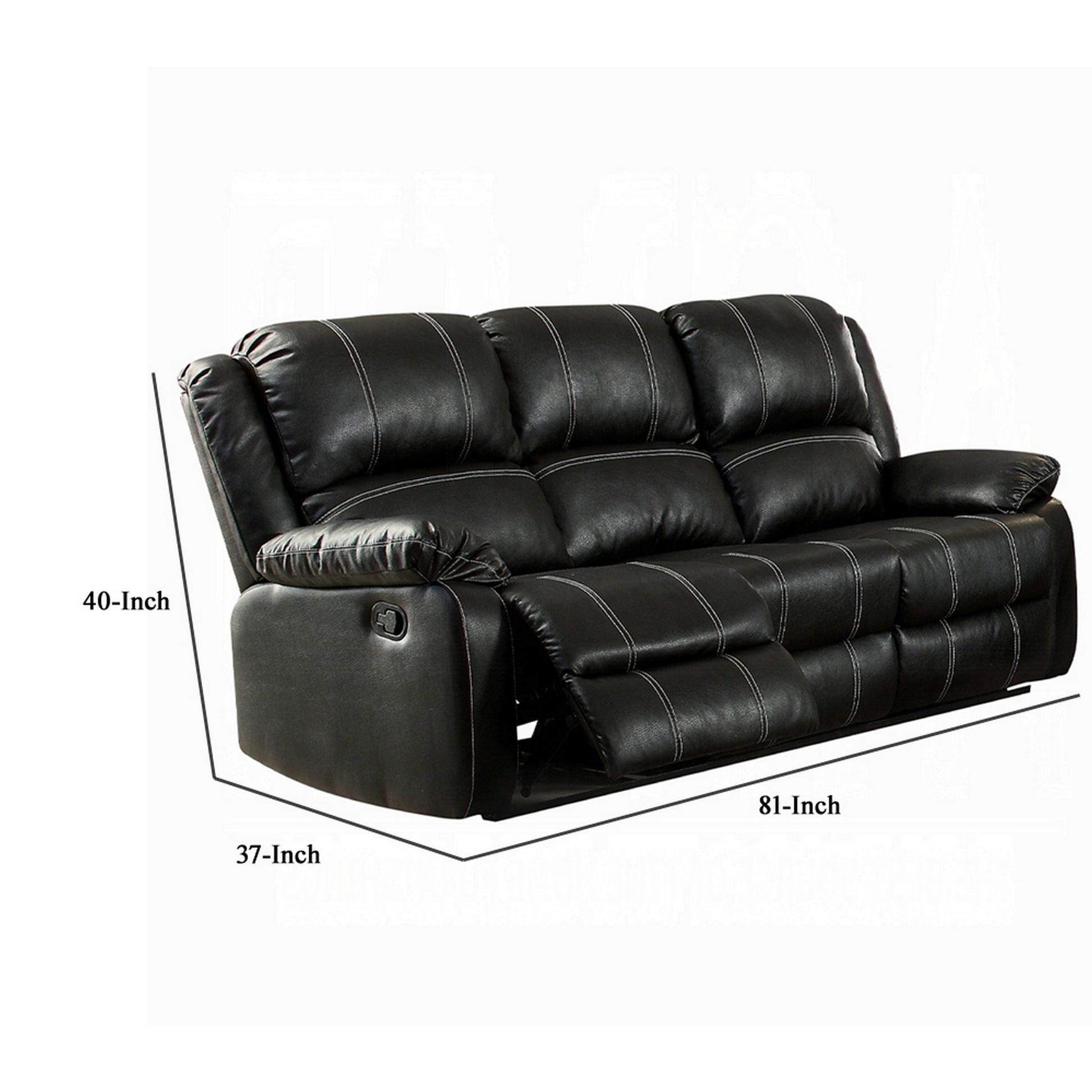 Enhance your living space with our Zuru motion recliner three-seater sofa. This recliner is crafted from durable metal and boasts a sleek design, creating a more open feel. It features a smooth motion reclining mechanism for effortless adjustments, plush pillow-tufted black faux leather upholstery, and tight pillow-top armrests. Check out our Zuru collection for more.